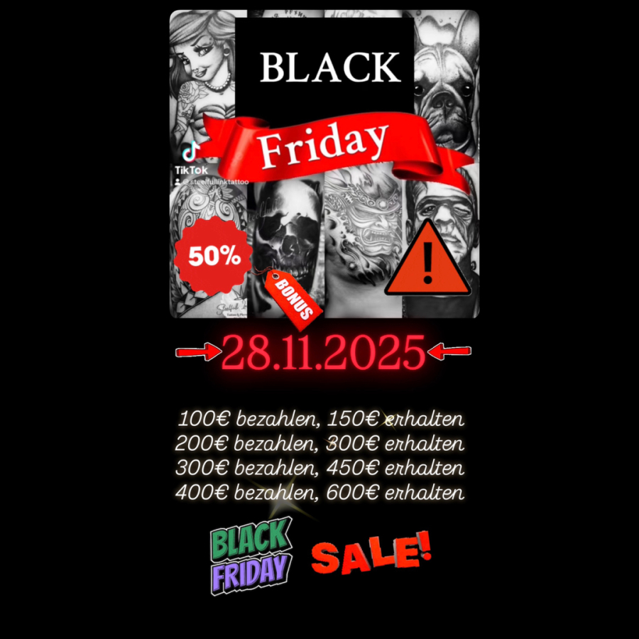 An diesem Tag bekommt jeder der einen Tattoo-Gutschein ab 100€ kauft 50% Bonus zu seinem Kaufpreis.